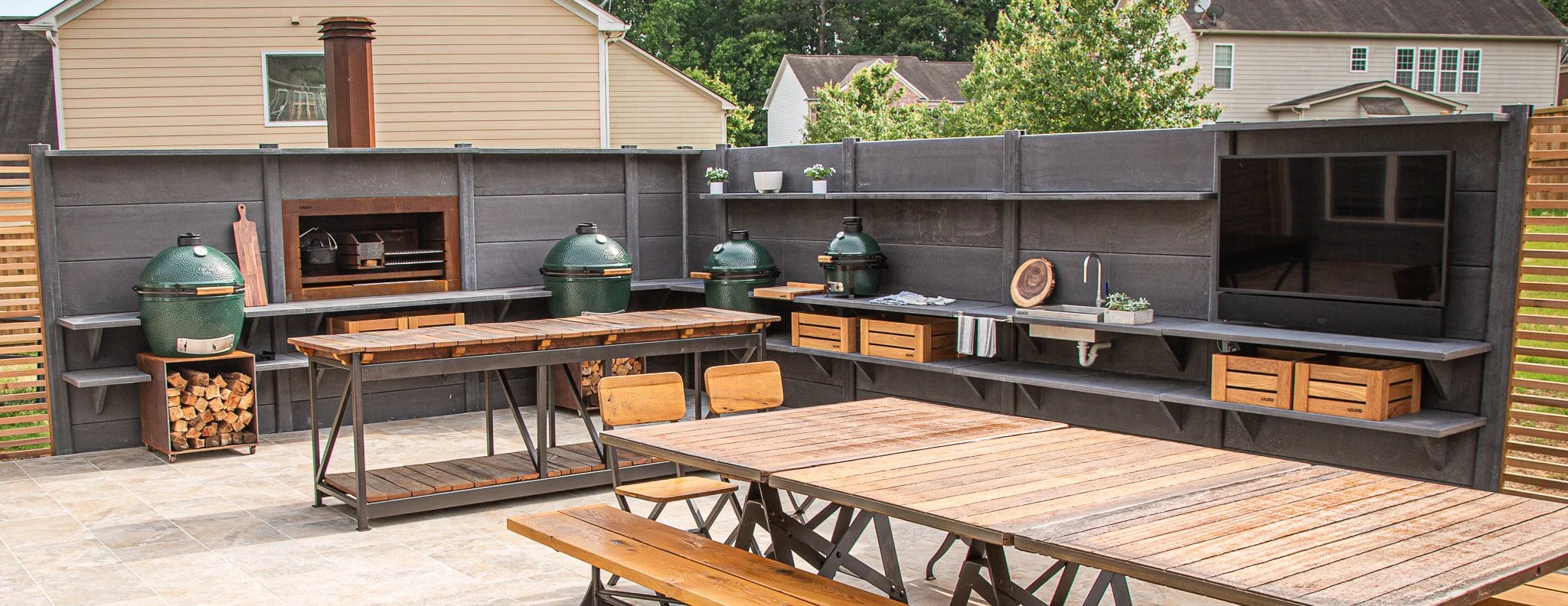 This celebrity chef’s outdoor kitchen is truly a standout! Designed in a bold dark grey finish, this 6’6” L-shaped kitchen combines style and functionality on a grand scale. The layout features not one, but three Big Green Eggs, our authentic South African braai, a stainless steel sink, and even a TV for entertainment. The kitchen’s braai side stretches 17.5 feet, while the TV side spans an impressive 23.5 feet, offering an expansive space for cooking, dining, and socializing.
