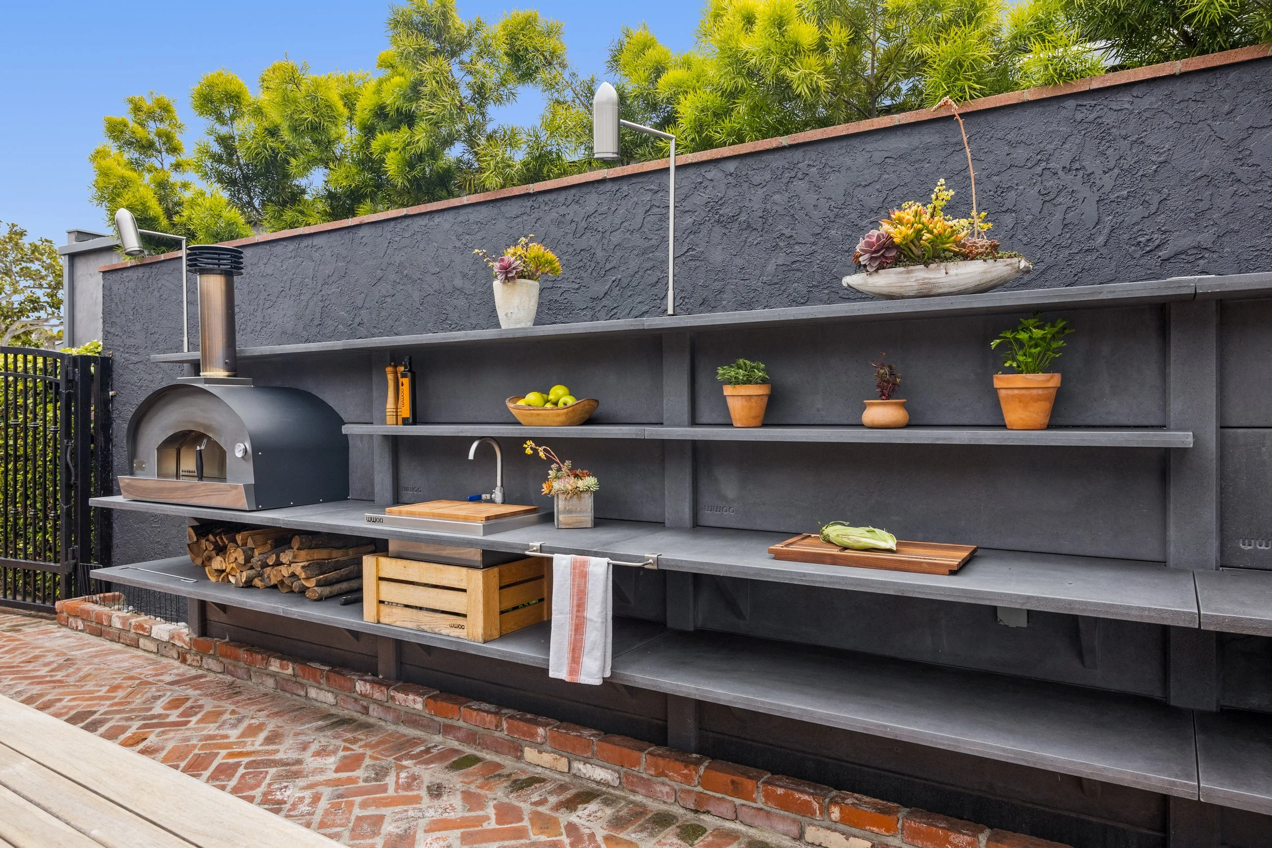 This sleek, space-savvy outdoor kitchen in Redondo Beach is a testament to WWOO’s versatility in designing for compact areas. The homeowners chose a 20-foot-long, 5'4" tall setup with 4 segments, maximizing functionality without compromising style. The design features a Sole Gourmet pizza oven, a gas grill, and a WWOO stainless steel sink, all integrated seamlessly into the dark-toned kitchen. Three bullet lights are strategically placed to provide focused illumination, adding both function and ambiance for evening gatherings.